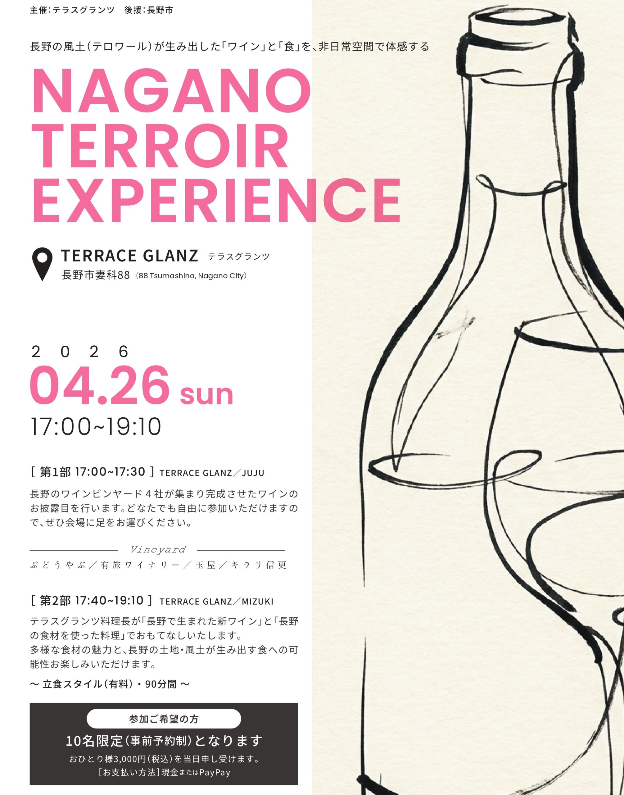 2026年4月26日(日)、テラスグランツにて「NAGANO TERROIR EXPERIENCE(後援:長野市)」を開催いたします。